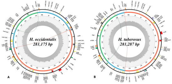 After reads trimming, 1,891,747 (H. occidentalis) and 2,283,878 (H. tuberosus) paired reads were gained. Since the content of mitochondrial DNA (more than 30% of total reads) was high, only a few high-coverage (>500 depth) contigs were generated, which made genome assembly easier. As a result, master cycle mitochondrial chromosomes were obtained for both studied sunflower species. The complete mitogenome of H. occidentalis (Figure 1A) counts 281,175 bp, and H. tuberosus (Figure 1B)—281,287 bp, which makes them more than 19.5 kbp smaller than the mitogenome of H. annuus. However, their mitogenomes have a length similar to other perennial (H. grosesserratus, H. strumosus) sunflower species. The GC content in both studied species is almost the same: 45.23% (H. occidentalis) and 45.22% (H. tuberosus). Besides the master cycle form, the mitogenome of each species can be presented by at least three subgenome circles (Figure 1) formed by the 150–250 bp repeats.