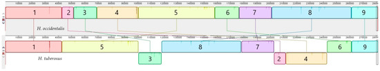 The progressive MAUVE alignment of H. occidentalis and H. tuberosus complete mitogenomes. According to sequence similarity, 9 syntenic blocks with a different order were identified.