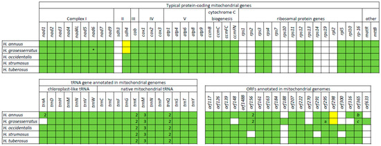 The distribution of protein-coding, tRNA genes, and ORFs among Helianthus species with complete mitogenomes. White square—the absence of the gene, green square—the presence of the gene, yellow square—the presence of pseudogene (premature stop codon). *, a, b, c = C–terminus shortening of the encoded proteins: a = orf216, b = orf334, c = orf284.