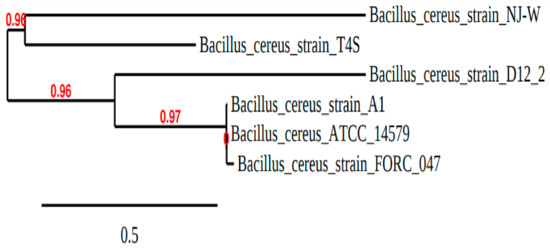 The biochemical and cultural characterization of B. cereus T4S is presented in Table S1. The results indicated that B. cereus T4S is rod-like, catalase-positive, and Gram-positive. The strain T4S assimilates all the tested sugars and exhibited a positive reaction to citrate, oxidase, nitrate, casein, and starch hydrolysis. Furthermore, strain T4S grows between pH ranging from 4 to 10, temperature from 25 to 45 °C, and 5.5% normal saline. The results of plant growth-promoting tests were high, with a siderophore value of 87.30%, phosphate content of 30.43 µg/mL, and IAA of 11.28 µg/mL, respectively (Table 1). Bacterial endophytes exhibited significant reactions for protease, xylanase, mannanase, and cellulase production, except amylase during enzyme plate assay. The phylogeny of the genome sequence of B. cereus strain T4S is presented in Figure 1.