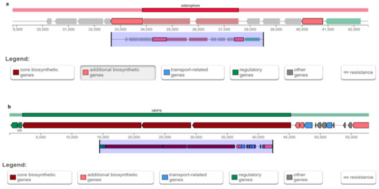 (a,b): Graphical representation of siderophore-and-nonribosomal peptide (NRPS)-encoding genes. These loci are predicted from the whole genome assembly of B. cereus T4S.
