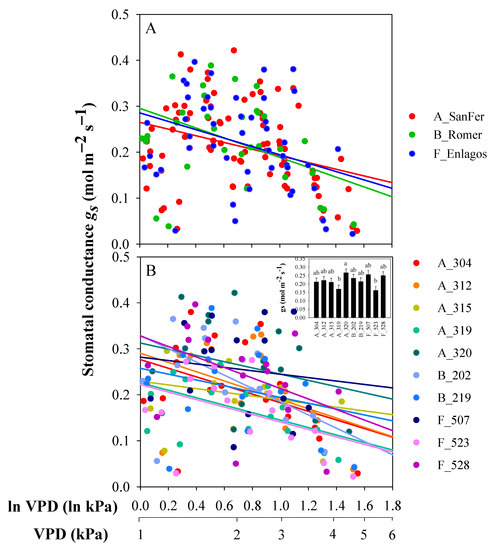 The ranges for VPD and gs measurements were 0.86 to 4.7 kPa and 0.02 to 0.43 mol m−2 s−1, respectively. There was great variability of gs across the VPD range, which was relatively uniform in the range of 1 to 3 kPa, and then it decreased (Figure 2). As expected, increasing VPD significantly decreased gs (Figure 2A provenance model: F1.162 = 35.23, p < 0.0001; Figure 2B clonal model: F1.162 = 38.32, p < 0.0001). The response of gs to VPD did not differ among provenances, as these exhibited the same slope (VPD × Provenance: F2.162 = 0.325, p = 0.7230) and Y-intercept (VPD × Clone: F2.162 = 0.0110, p < 0.8960) (Figure 2A). However, at the clonal level we found a similar slope (VPD × Provenance: F9.148 = 0.4790, p = 0.8872) but different Y-intercept (VPD × Clone: F9.148 = 2.445, p = 0.0127) (Figure 2B). Then, the average slope was −0.082, and the reference stomatal conductance (gref) at 1 kPa of VPD was 0.277 mol m−2 s−1 (m-to-gref ratio was 0.3). The average gs for the study period was not related to provenance origin and was significantly higher for clone A_320 from provenance SanFer, whereas the lowest values were observed for clones A_319 (SanFer provenance) and F_523 (Enlagos provenance) (Figure 2B inset graph).