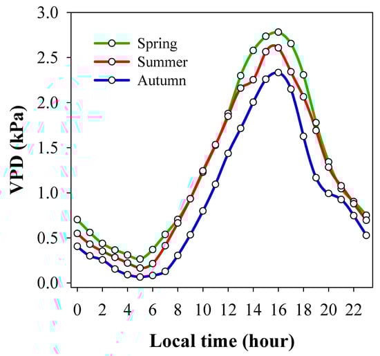 Diurnal variation of vapor pressure deficit (VPD) in the experimental location at the end of spring, midsummer, and the beginning of autumn.