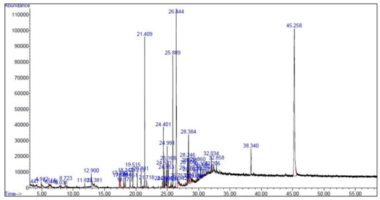 Gas chromatography and mass spectroscopy chromatogram of the methanolic extract of the Gracilariopsis persica alga.