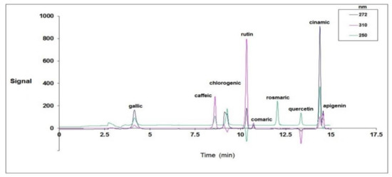 Figure 2 displays the standard HPLC chromatogram of all the recorded compounds at 250, 272, and 310 nm. According to Figure 2, all the studied compounds responded to the three spectra and were isolated successfully. The compounds of the alga extract were also separated using the same method at the same wavelengths, and they were identified using the standard graph (Figure 3a–c).