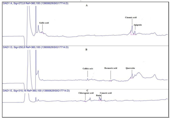 The diagram of identifying the phenolic compounds using the HPLC method at three wavelengths of (A) 272 nm, (B) 250 nm, and (C) 310 nm.