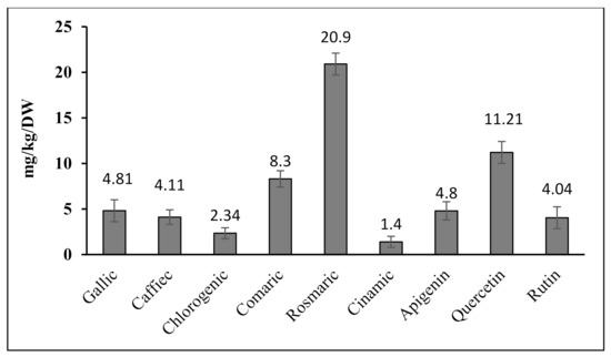 The quantitative results for the phenolic compounds using the HPLC method showed that the most abundant phenols in G. Persica were rosmarinic acid (20.9 ± 0.41 mg/kg DW) and quercetin (11.21 ± 0.20 mg/kg DW), and the least abundant was cinnamic acid (1.4 ± 0.10 mg/kg DW) (Figure 3 and Figure 4).