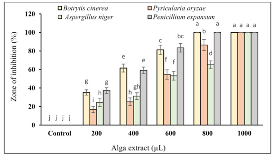 The results as to the effect of the alga extract on the mycelial growth of the studied fungi revealed a clear dose–response of the extract. The 100% inhibition was achieved at 800 and 1000 μL for B. cinerea and P. expansum (Figure S1) and 1000 μL for P. oryzae and A. niger (Figure S2).