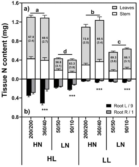 Under HN conditions, shoot N content was higher in the HL than LL plants (Figure 2; F(1,88) = 4.24, p = 0.042), with the opposite trend noted under LN conditions, such that LL had a higher shoot N content than HL plants (F(1,88) = 50.79, p < 0.001). This was not simply due to a change in the distribution between shoots and roots, since the total N content in LL/LN plants was significantly higher than the HL/LN plants (F(1,88) = 83.04, p < 0.001). Similarly, the HL/HN plants had a higher total N content than the LL/HN plants (F(1,88) = 252.93, p < 0.001), suggesting that not all of the supplied N could be taken up under LL/HN conditions. Root N content was strongly influenced by root mass, although the N concentrations varied among the treatments. Generally, the root N concentration was higher at HL than LL (F(1,88) = 7.61, p = 0.007) and under LN conditions (F(1,88) = 133.50, p < 0.001). Root N content was not different between left and right roots in the equal treatments (p > 0.05) but was significantly greater in the high N than low N roots (p < 0.001) in the unequal treatments.