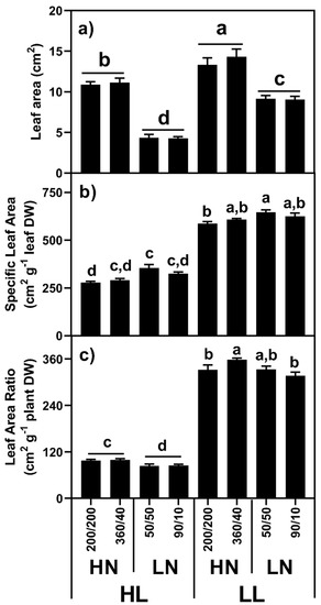 Leaf area was influenced by both light and N supply, with higher leaf areas under LL and HN conditions. These high leaf areas were achieved in the LL plants by a significant increase in SLA, with N level having only a small influence on SLA, patterns consistent with previous reports [9]. We also calculated the leaf area ratio (LAR) to help us evaluate the relationship between C fixation and demand, assuming that the former is a function of leaf area, while the latter a function of plant mass. Broadly speaking, LL plants had approximately four-times more leaf area supporting each unit of plant tissue, presumably to compensate for the low photon flux density.