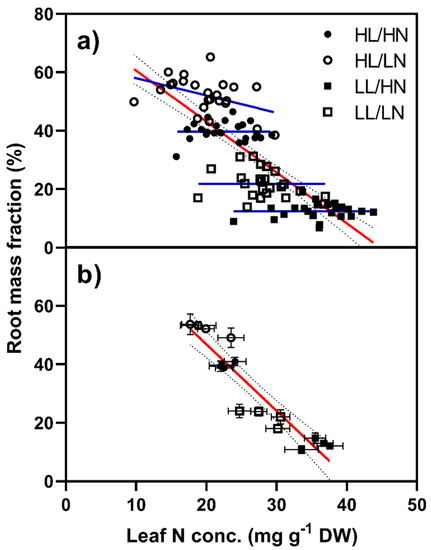Root mass fraction plotted against leaf N concentration for Poa annua plants grown under high (HL) or low light (LL) conditions and supplied high (400 µg) or low N (100 µg). The red line represents a regression of RMF against leaf N concentration. In (a) each datapoint represents an individual plant and the blue lines represent regression lines for each treatment while in (b) each datapoint represents the mean of six replicates, with the error bars representing standard errors.