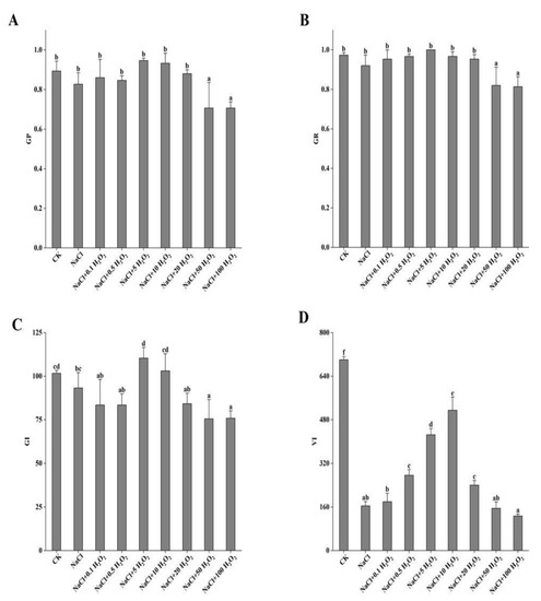 Effect of H2O2 pretreatment on the GP (A), GR (B), GI (C), and VI (D) of F. tataricum seeds under NaCl stress. CK, control treatment (only water); NaCl, 50 mmol L−1 NaCl treatment; NaCl + xxx H2O2, treatments of standard NaCl + respective H2O2 concentration; GP, germination potential; GR, germination rate; GI, germination index; VI, vigor index. Different lowercase letters on each column indicate significant differences between treatments at p < 0.05.