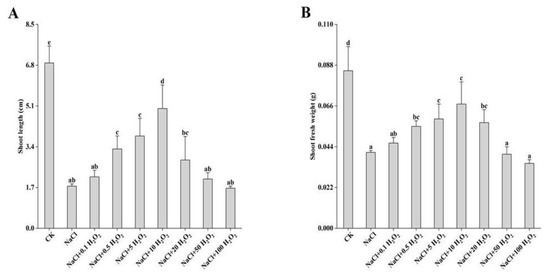 Effect of H2O2 on SL (A) and SFW (B) of F. tataricum seedlings under NaCl stress. CK, control treatment (only water); NaCl, 50 mmol L−1 NaCl treatment; NaCl + xxx H2O2, treatments of standard NaCl + respective H2O2 concentration; SL, shoot length (cm); SFW, shoot fresh weight (g). Different lowercase letters on each column indicate significant differences between treatments at p < 0.05.