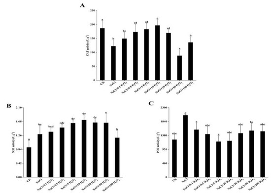 Effect of H2O2 pretreatment on the activity of CAT (A), SOD (B), and POD (C) in F. tataricum seedlings under NaCl stress. CK, control treatment (only water); NaCl, 50 mmol L−1 NaCl treatment; NaCl + xxx H2O2, treatments of standard NaCl + respective H2O2 concentration; CAT, catalase (U g−1); SOD, superoxide dismutase (U g−1); POD, peroxidase (U g−1). Different lowercase letters on each column indicate significant differences between treatments at p < 0.05.