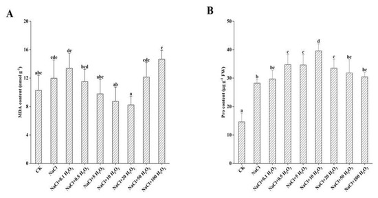 Effect of H2O2 on MDA (A) and Pro (B) contents of F. tataricum seedlings under NaCl stress. CK, control treatment (only water); NaCl, 50 mmol L−1 NaCl treatment; NaCl + xxx H2O2, treatments of standard NaCl + respective H2O2 concentration; MDA, malondialdehyde (nmol g−1); Pro, proline (µg g−1 FW). Different lowercase letters on each column indicate significant differences between treatments at p < 0.05.