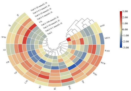 Hierarchical cluster analysis among various salt tolerance indices under different treatments. CK, control treatment (only water); NaCl, 50 mmol L−1 NaCl treatment; NaCl + xxx H, treatments of standard NaCl + respective H2O2 concentration.
