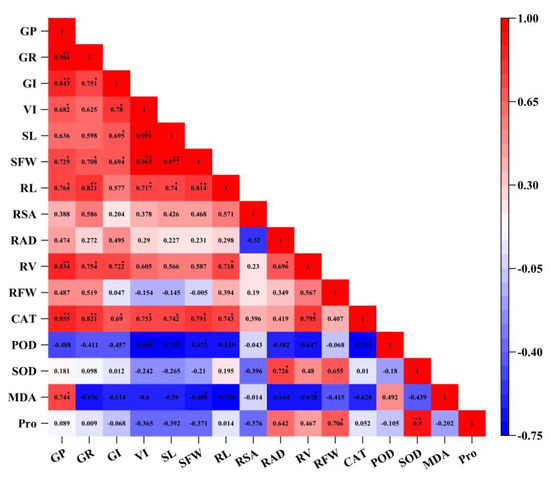 Correlation matrix between all indices. GP, germination potential; GR, germination rate; GI, germination index; VI, vigor index; SL, shoot length; SFW, shoot fresh weight; RL, root length; RSA, root surface area; RAD, root average diameter; RV, root volume; RFW, root fresh weight; CAT, catalase; SOD, superoxide dismutase; POD, peroxidase; MDA, malondialdehyde; Pro, proline. Numbers represent the Pearson correlation statistics. ** denotes significance at p < 0.01; * denotes significance at p < 0.05.