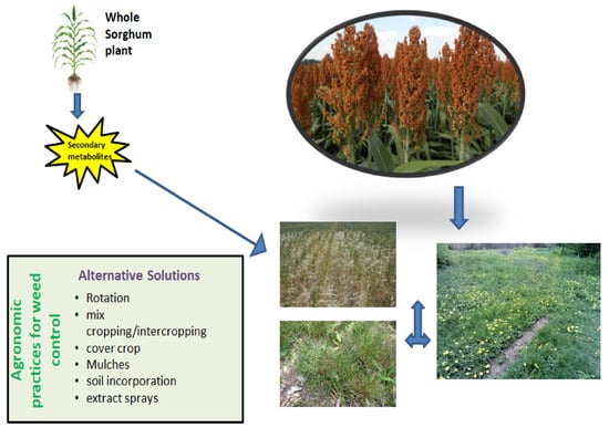 Allelochemicals secreted by sorghum plants directly influenced the growth of cultivated plants (such as rice and maize) in laboratory, greenhouse and field experiments [65,66]. Sorghum phytotoxicity differs with the plant organ, age, environmental factors, genotype and targeted weed species. Sorghum can be utilized in various ways to affect weeds, e.g., as surface mulch [67], by assimilation in soil [68], in aqueous extracts sprays [21], or by rotation [69], smothering [70] or mix cropping [71]. Figure 1 illustrates how sorghum can impact different weeds through several biological control practices. Suppressive effects on purple nutsedge density by incorporation of sorghum roots, stems and leaves in the soil have been reported by [72]. Similarly, foliar addition of a sorgaab (sorghum water extract) decreased the density and dry weight of purple nutsedge up to 44 and 67%, respectively, with an increase in maize grain yield of 44% [73]. Allelopathic effects of sorghum depend upon the genotype, age, location, environmental conditions and cropping system.