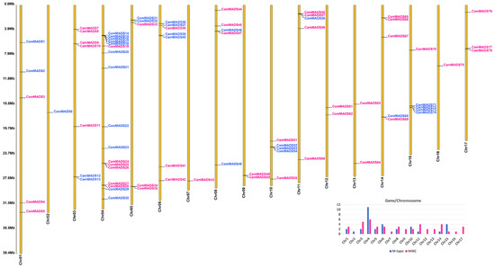 Chromosomal localization of the seventy-eight C. americana MADS-box genes. The number of each chromosome is given under the lines, blue indicates M-type genes, and pink indicates MIKC-type. The right side of each chromosome is related to the approximate physical location of each MADS-box gene. Bottom right: a plot of the number and type of CamMADS genes per chromosome.