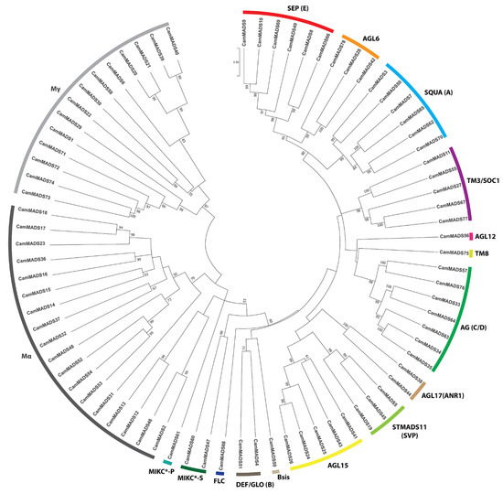 Maximum likelihood tree of CamMADS proteins in C. americana. The tree shows type I subgroups (Mα-type, Mγ-type), while the type I Mβ-type group was absent. Type II subgroups; MIKCC (SQUA (A), DEF/GLO (B), AG (C/D), SEP (E), AGL6, AGL12, AGL15, AGL17 (ANR1), Bsis, TM3/SOC1, STMADS11 (SVP), FLC, and TM8. The MIKC* subgroups (MIKC*-S and MIKC*).