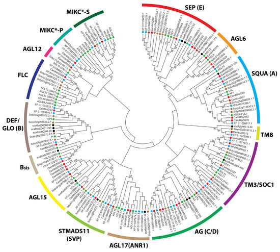 - Wang, Y.; Zhang, J.; Hu, Z.; Guo, X.; Tian, S.; Chen, G. Genome-Wide analysis of the MADS-Box transcription factor family in Solanum lycopersicum. Int. J. Mol. Sci. 2019, 20, 2961. [Google Scholar] [CrossRef] [Green Version]