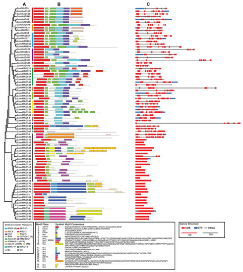 Gene structure and conserved motif analysis of C. americana MADS-box proteins: (A) CamMADS proteins phylogenetic relationship, (B) motif analysis of CamMADS proteins, each motif is represented by a number in a colored box mid-bottom. Box length corresponds to motif length, (C) CamMADS gene structure analysis (exons are in red, introns represented by solid line, and untranslated regions are in blue).