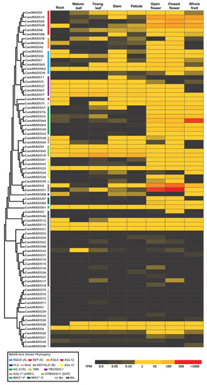 Heatmap of CamMADS genes expression level (TPM) is each of the following tissues: root, mature leaf, young leaf, stem, petiole, open flower, closed flower, and whole fruit. The phylogenetic tree is to the far left, and the box at the bottom left indicates the subgroups of CamMADS genes.