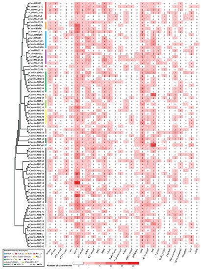 To further assess the functions of CamMADS genes, the upstream 2 kb promoter region was analyzed for cis-acting regulatory elements, as shown in Figure 7. The following elements of key roles have been identified: W-boxes and TC-reach repeats are defense and stress-inducible promoters. AE-box, AT1-motif, chs, Box4, TCT-motif, G-box, and GT1-motif are involved in light responsiveness. MBS is the drought resistance-induced MYB binding site. ABRE is an abscisic acid response element. MeJA is the CGTCA-motif methyl jasmonate response element. AuxRR-core and TGA-element are regulatory auxin responsiveness elements. P-box, GARE-motif, and TATC-box are gibberellin response elements. STRE and WUN-motif are wound response elements. ARE is an anti-oxidant response element. O2-site is involved in zein metabolism regulation. GCN4_motif is involved in endosperm expression. CAT-box is related to meristem expression. TCA-motif is a salicylic acid response element. Circadian are cis-acting regulatory element involved in circadian control. LTR is involved in low-temperature responsiveness. MBSI is involved in flavonoid biosynthetic gene regulation.