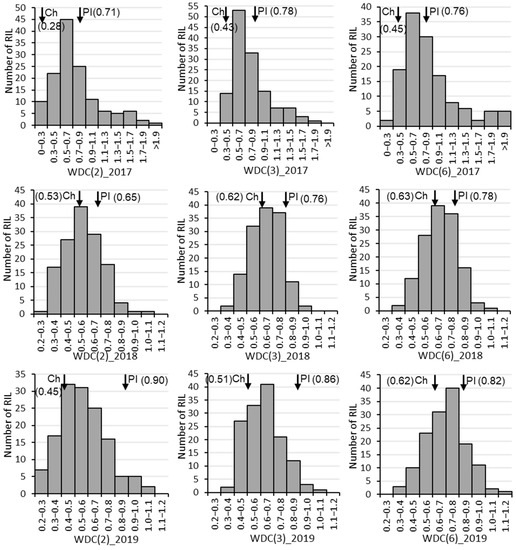 Frequencies in recombinant inbred line number for weighted drought coefficient (WDC) from 2017 to 2019. Ch and PI next to the inverted arrow (↓) with WDC value inside parentheses are abbreviated for the parents ‘Cheonsang’ and ‘PI416937’, respectively. The values in the parentheses after WDC indicate the number of traits considered to calculate WDC: 2 (biomass and leaf area), 3 (plant height, biomass, and leaf area), and 6 (plant height, node number, branch number, pod number, biomass, and leaf area).