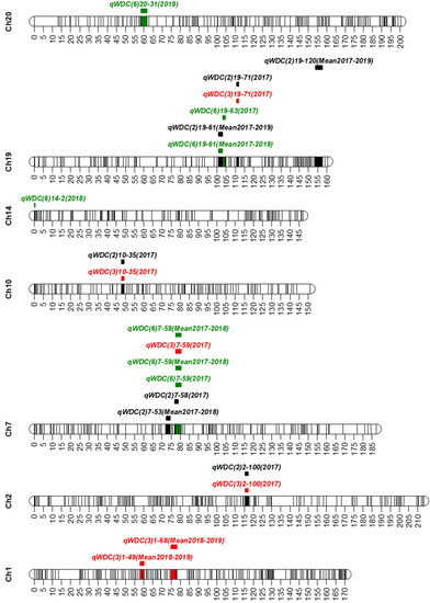 Positions of the QTLs for drought tolerance on seven chromosomes (Ch). q: QTL, WDC: weighted drought coefficient. In the QTL names, the first number in the parentheses after WDC represents the number of traits considered to calculate WDC (black, red, and green for 2, 3, and 6 traits, respectively; the second number is for chromosome name; the number after a dash (-) represents the sequential number of the marker on the linkage map; and mean denotes the average value of the traits in different years (2017–2019). The lines inside the chromosomes represent the position of markers used to construct the linkage map. The colored bars indicate the QTL regions. The scaled numbers next to chromosomes indicate the genetic length (cM) of the chromosome.
