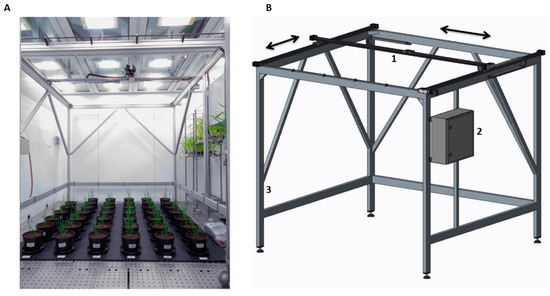 (A) Phenocave installed in the Biotron chamber with two imaging sensors mounted, a DSLR Canon EOS and a multispectral MicaSense Altum; (B) schematic Phenocave model. The gray arrows indicate the movement on the XY coordinates.