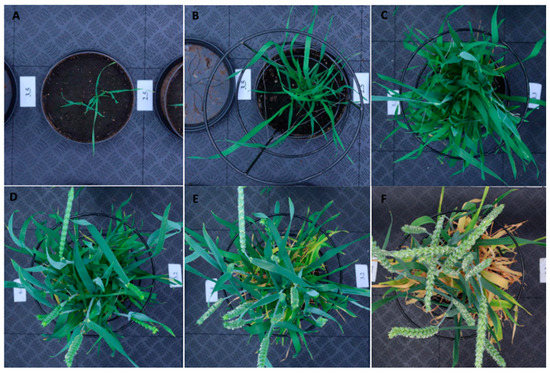 Representative red–green–blue (RGB) images from Phenocave before processing. Spring wheat plants at various growth stages: (A) seedling, (B) tillering, (C) stem elongation, (D) booting, (E) heading, and (F) grain filling.