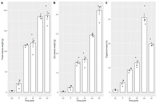 Fresh leaves (A), dry leaves (B), and digital biomass (C) obtained from different growth stages, namely, seedling (Sd), tillering (TI), stem elongation (Se), booting (Bt), heading (Hd), and grain filling (GF). Error bars are standard error.