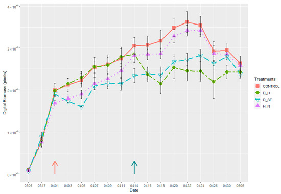 Plant growth pattern under different treatments, (control, drought at stem elongation (D_SE), drought at heading (D_H), and high nitrogen content (H_N)), from sowing to grain development. Pink arrow indicates when drought stress was induced, D_SE; dark cyan arrow indicates when drought stress was induced, D_H, and second nitrogen dosage was applied, H_N. The Y-axis represents the time points when the digital biomass was sampled and the X-axis represents the mean values of the obtained digital biomass. Error bars are standard error.