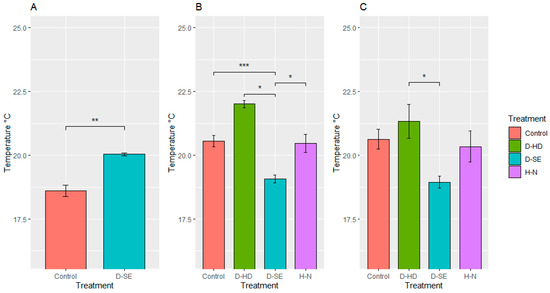 Surface temperature of plants under different treatments, (control, drought at stem elongation (D-SE), drought at heading (D-HD), and high nitrogen content (H-N)). The X-axis represents the treatments and the Y-axis represents the mean temperature values obtained with QGIS software. Statistically significant differences (Tukey’s HSD *** p < 0.001, ** p < 0.01 and * p < 0.05) are denoted by the stars above the bars. Error bars are standard error. Temperature measurements (A) after five days of inducing drought stress at stem elongation, D_SE and (B) after five days of inducing drought stress at heading, D_HD, and second dosage of liquid nitrogen fertilizer was applied, H-N. (C) Temperature measurements when all plants were irrigated.