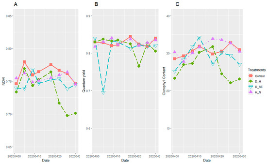 Plants development curves obtained with handheld sensors versus sampling dates (from stem elongation to grain filling stage), clustered based on their treatment forming four groups (control, drought at stem elongation (D_SE), drought at heading (D_H), and high nitrogen content (H_N). (A) Normalized difference vegetation index (NDVI); (B) quantum yield (QY); (C) chlorophyll content index (CC).