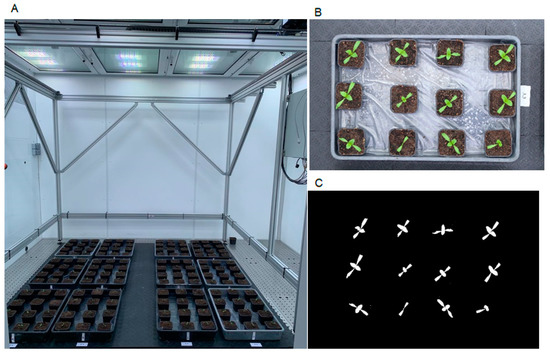 (A) Sugar beet experiment installed in Phenocave; (B) individual image of sugar beet plants per tray; (C) image after processing with the developed pipeline.