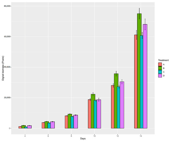 Plant germination and development of plants from seeds with different treatments: (A) control; (B) primed; (C) pelleted and coated; and (D) primed, pelleted, and coated; from sowing to 15 days after sowing. The Y-axis represents the digital biomass in pixels and the X-axis represents sampling days.