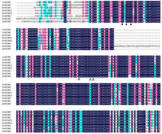 Alignment of the amino acid sequences of HCAR proteins among seven species. Conserved residues are shaded with black. Filled triangles represent the cysteine residues that are predicted to coordinate the iron-sulfur cluster. Open triangles represent the conserved sequence motif in FAD-containing proteins (K×××××G×G). Cs, Cucumis sativus; Cm, Cucumis melo; At, Arabidopsis thaliana; Nt, Nicotiana tabacum; Sl, Solanum lycopersicum; Os, Oryza sativa; Zm, Zea mays.