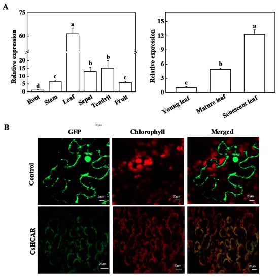 Expression patterns of CsHCAR in different tissues and its subcellular localization. (A) qPCR analysis of the expression of CsHCAR in roots, stems, leaves, fruits, sepals, and tendrils of cucumber. The expression level in roots or young leaf was set to 1.0. The results represent the mean ± SE (n = 3). Means with the same letter did not significantly differ at p < 0.05 according to Tukey’s test. (B) Subcellular localization of CsHCAR in tobacco cells. Bars: 20 μm.