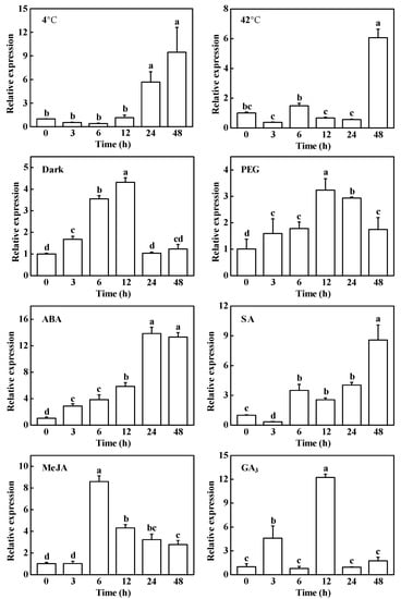 Expression patterns of CsHCAR in cucumber leaves under different abiotic stresses and phytohormone treatments. 4 °C, 42 °C, dark, and PEG represented cucumber plants treated with cold, heat, darkness, and drought stress, respectively. ABA, SA, MeJA, and GA3 represented cucumber foliar treated with 100 μM ABA, 100 μM SA, 100 μM MeJA, and 100 μM GA3, respectively. The leaf samples were collected at the indicated time points and analyzed by qPCR. The results represent the mean ± SE (n = 3). Means with the same letter did not significantly differ at p < 0.05 according to Tukey’s test.