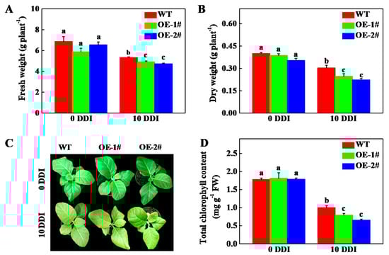 For measurement of the FW and DW of tobacco seedlings, the plants were washed with distilled water and dried with absorbent paper after darkness stress for 10 d. The FW was measured by electronic balance (Sartorius, Goettingen, Germany). After that, the whole plants were enclosed in the envelopes and placed in an oven (Shanghai Yiheng Scientific Instrument Co., Ltd., Shanghai, China) at 105 °C for 15 min. Afterward, the oven temperature was adjusted to 75 °C to obtain a constant DW.