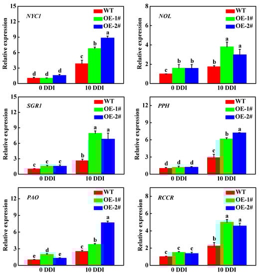 Expression of chlorophyll degradation related genes in leaves of wild-type and CsHCAR overexpression tobacco seedlings. The results represent the mean ± SE (n = 3). Means with the same letter did not significantly differ at p < 0.05 according to Tukey’s test. WT, wild-type; OE-1# and OE-2#, 2 independent transgenic tobacco overexpression of CsHCAR. DDI, day(s) of dark incubation; NYC1, non-yellow coloring1; NOL, NYC1-like; SGR1, stay-green1; PPH, pheophytinase; PAO, pheophorbide a oxygenase; RCCR, red chlorophyll catabolite reductase.