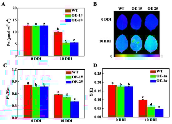 Effects of darkness on the photosynthesis and chlorophyll fluorescence of CsHCAR overexpression tobacco seedlings. (A) Net photosynthetic rate (Pn). (B,C) The maximum quantum yield of photosystem II (Fv/Fm). (D) The effective quantum yield of photosystem II [Y(II)]. The results represent the mean ± SE (n = 3). Means with the same letter did not significantly differ at p < 0.05 according to Tukey’s test. WT, wild-type; OE-1# and OE-2#, 2 independent transgenic tobacco overexpression of CsHCAR; DDI, day(s) of dark incubation.