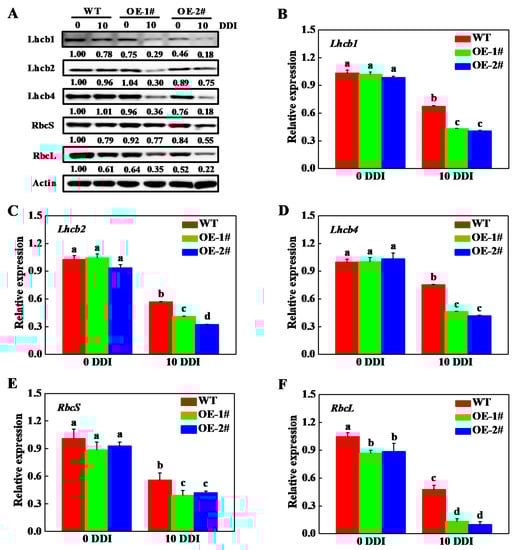 The abundance of photosystem proteins and the expression of related genes in CsHCAR overexpression transgenic tobacco seedlings. (A) Immunoblotting analysis of the protein abundance of photosystem proteins. The band intensity was quantified using Image J software to calculate to the protein level relative to the 0 d of WT plants, which was set to 1. The relative protein level is shown under the band; (B) the expression of Lhcb1; (C) the expression of Lhcb2; (D) the expression of Lhcb4; (E) the expression of RbcS; (F) the expression of RbcL. The results represent the mean ± SE (n = 3). Means with the same letter did not significantly differ at p < 0.05 according to Tukey’s test. WT, wild-type; OE-1# and OE-2#, 2 independent transgenic tobacco overexpression of CsHCAR; DDI, day(s) of dark incubation.