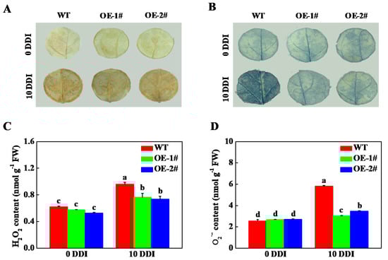 The H2O2 concentration in leaves was estimated by a method described previously []. The superoxide anion (O2•−) production was determined as previously described []. Tobacco leaves treated with darkness for 0 d and 10 d were cut into 1.5 cm leaf discs for H2O2 and O2•− staining. DAB staining method was used for H2O2 histochemical staining []. After soaking tobacco leaf plates in 50 mM Tris-HCl (pH 3.8) solution containing 1 mg L−1 DAB, they were subjected to light for staining until the brown spots appeared on the leaves. O2•− histochemical staining was performed using NBT []. After soaking tobacco leaves in 25 mM HEPES (pH 7.8) solution containing 1 mg L−1 NBT, they were dyed in the dark for 3–5 h. Decolorization was carried out in boiling water bath with 95% ethanol until Chl was completely removed from the leaves.