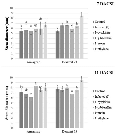 | Stem diameter | 6.57 ± 0.99 a | 7.20 ± 1.16 b | 0.036 |