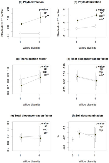- Fortin Faubert, M.; Desjardins, D.; Hijri, M.; Labrecque, M. Willows Used for Phytoremediation Increased Organic Contaminant Concentrations in Soil Surface. Appl. Sci. 2021, 11, 2979. [Google Scholar] [CrossRef]