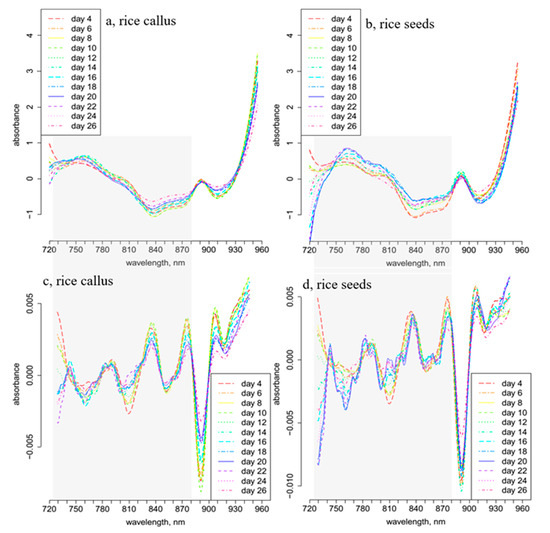 The daily average spectra and 2nd derivative spectra of callus and rice seeds were calculated and plotted (Figure 1) to examine the spectral changes that occurred during the 26 days of seedling growth, and to find the wavelength ranges showing the largest variation. A relatively sharp and dominant peak was observed at 890 nm in the spectra of both callus and rice seed samples (Figure 1a,b). This region is known as the 3rd overtone of CH and CH2 bonds [45,46]. Since both cultures were grown in carbohydrate-rich media, this band at 890 nm can be attributed to sugars, i.e., it has no relevance to the samples investigated.