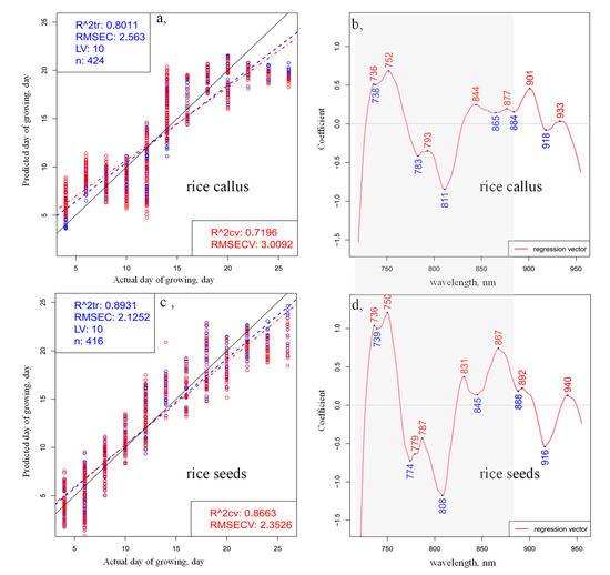 PLSR analysis using time as a dependent variable (the day of development) performed on the preprocessed (smoothing, SNV and linear detrend) transmittance spectra in the spectral range between 720 and 955 nm of (a) 28 callus samples and (c) 28 rice seedlings; regression vector of the PLSR models for (b) callus samples and (d) rice seedlings (blue circles indicate the calibration and red circles the cross-validation data points; blue dashed lines indicate the calibration Y-fit and red dashed lines the cross-validation Y-fit, while black continuous lines show the Y-fit of ideal prediction).